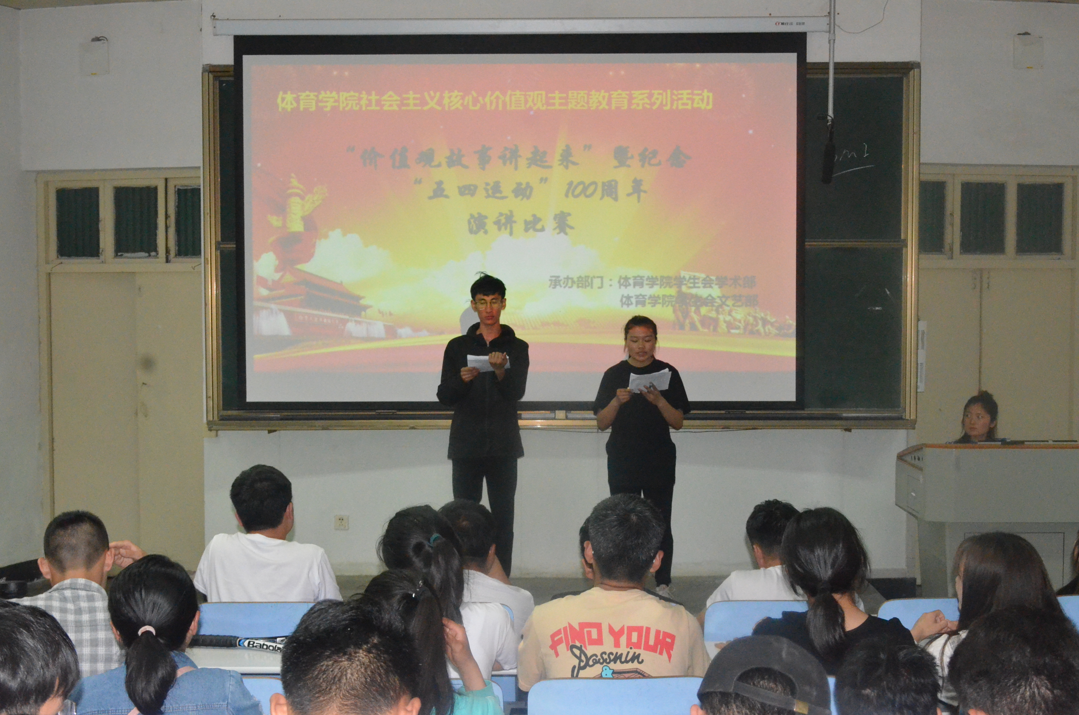 2019年4月18日晚七点,为了更好的引导广大师生做社会主义核心价值观的坚定信仰者,积极传播者和模范践行者,体育学院于人文楼举行社会主义核心价值观主题教育系列活动“值观故事讲起来”暨纪念五四运动100周年演讲比赛,演讲内容围绕社会主义核心价值观关键词:爱国,敬业,诚信,友善。出席本次活动的有体育学院团委老师程俊辉、学生会主席马逸行、学生会干部以及演讲爱好者等。